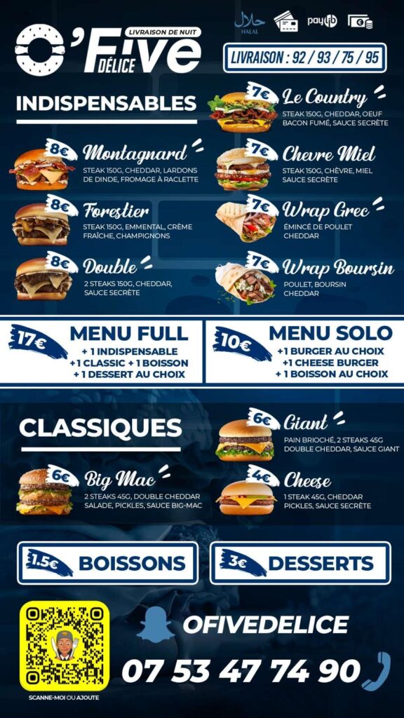 O’Five delice vous propose de savoureux Burgers et Tortillas en livraison de nuit 7 jours sur 7 de 21h à 5h.